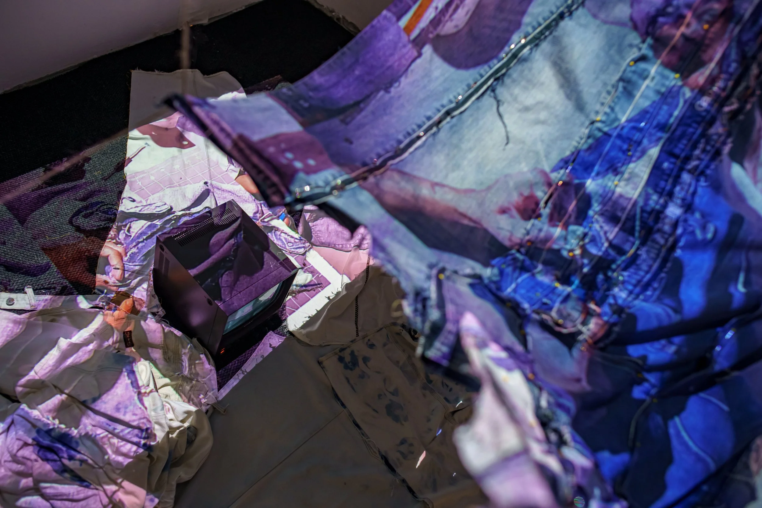 The light-image that spills from Fran’s installation is soft like fabric, so I stick my head around the corner, my body a fold. A sign tells me I should unwear my shoes. Hand against wall, weight on one foot. The gestures I make bodying forth a too-familiar invitation. “Oh, I’m sorry, but do you mind—” Composed of hanging denim textiles, repurposed and stitched together from piles of disassembled jeans, the threshold of tastas at kidkid seems to hinge at multiple forms of belonging—to be a body, or its alienated labor, a guest or a host, to play or be played with, to provide shelter or be held by it. Here, the form of the jean is iconically American, yet in seeming ready-made, masks the systems of production, colonial expansion and physical trace that compose its making. But by manipulating the jean—ripping, bleaching, draping, Fran excavates these subterranean dynamics via embodied action. Her installation wide open to resignification through my active, sensory experience of it. Are these makeshift tents, or imaginary forts, shed skins or ornamental coverings? Patterned as they are by video projections of her hands, unstitching jeans in an endless loop, I note most the tangible evidence of domestic work, set against the immateriality, indeed invisibility, of its skilled labor.